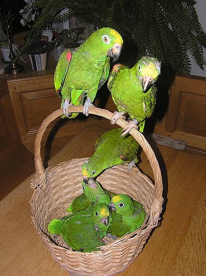 Mit zahmen Brutpaaren sind Familienausflüge vom Zucht- in den Wohnbereich kein Problem. Sie sorgen dafür, daß die Jungvögel frühzeitig mit Menschen vertraut werden.