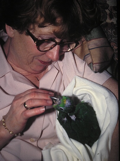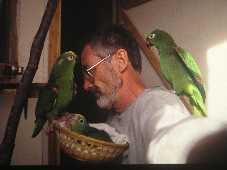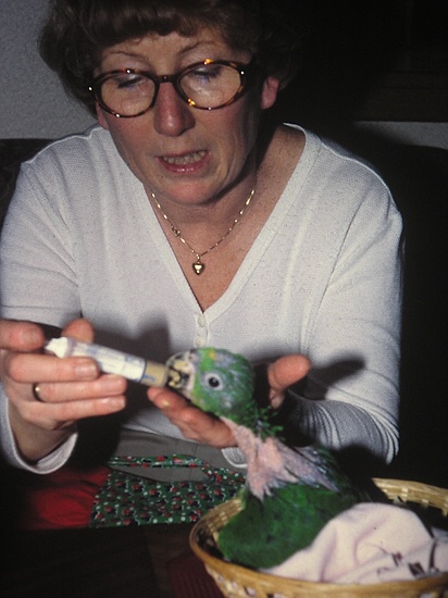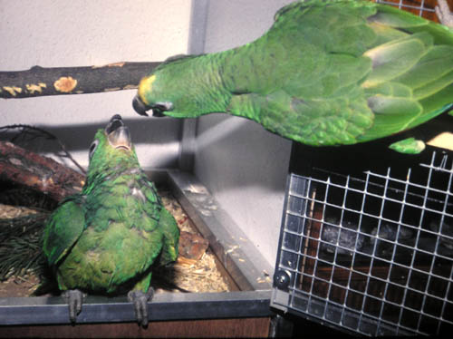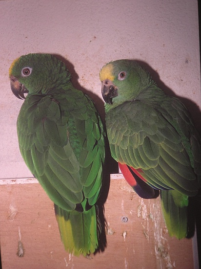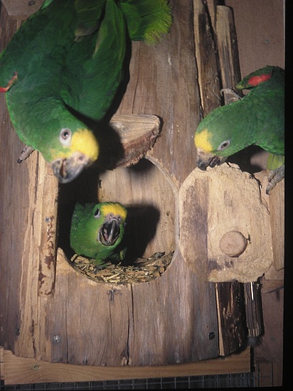 Das Bild links dokumentiert meinen ersten Versuch einen Jungvogel in Anwesenheit der Eltern aus der Bruthöhle zu nehmen um ihn an Menschen zu gewöhnen. Haben hier die Vögel nicht volles Vertrauen zu ihrem Halter, kann das mit blutigen Attacken enden. Auch bei dem Weibchen (links im Bild) handelt es sich um eine frühzeitg mit Artgenossen sozialisierte Notfall-Handaufzucht. So gesehen macht Handaufzucht sogar Sinn, denn der Nachwuchs den zahme (handaufgezogene aber richtig sozialisierte) Eltern in Naturbrut aufziehen wird genauso zahm wie seine Eltern (und spart nebenbei dem Züchter eine Menge Arbeit).