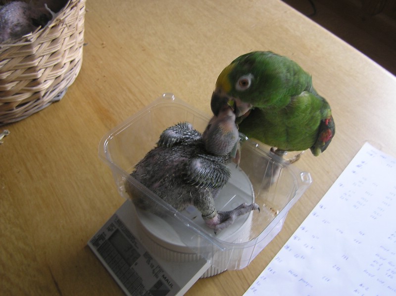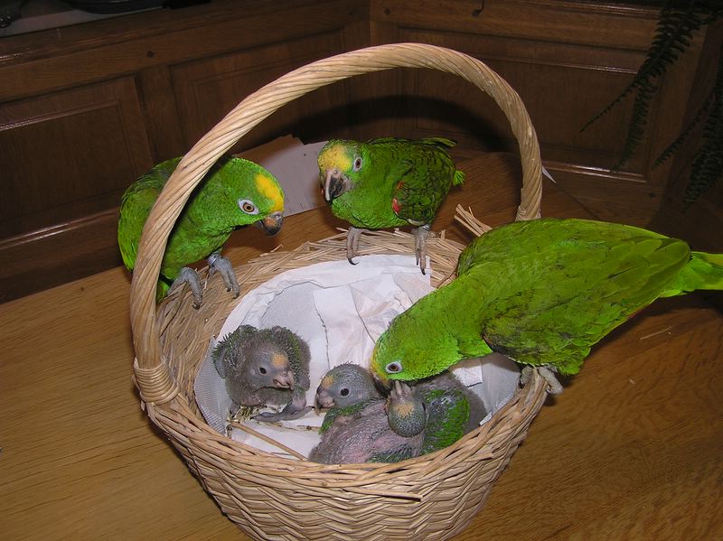 Als ich die ersten Male Jungtiere zurückbrachte, rechnete ich mit Angriffen der Elterntiere, denn nach den mir bekannten Zuchtberichten (aus den 1970er und 1980er Jahren, Zuchtpaare waren hier noch ausschließlich Wildfänge) war es ratsam, Volieren mit brütenden Amazonen nur in spezieller Schutzkleidung zu betreten. Es geschah jedoch nichts dergleichen, die Eltern sahen meinen Bemühungen sogar mit sichtlichem Wohlwollen zu. Im Grunde war das aber selbstverständlich: Warum sollten Papageieneltern, die nichts dabei fanden, selbst auf die Hand oder die Schulter zu gehen, sich daran stören, wenn man ihren Nachwuchs auf oder in die Hand nimmt?