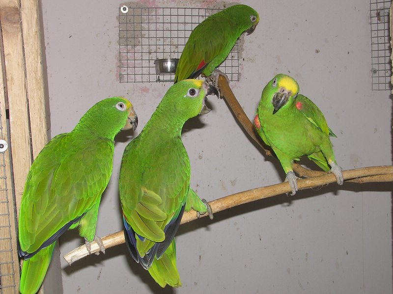 So vorteilhaft das hautnahe Erleben der Jungenaufzucht für die älteren Geschwister zweifellos ist, für die gerade ausgeflogenen Jungtiere ist dies weniger lustig, und so enden diese Spiele häufig mit ihren Hilferufen. Bei Amazonen sind das ganz typische, kaum zu verwechselnde, in schneller Folge stoßweise hervorgebrachte Kreischlaute. Während die Eltern Artgenossen, die nicht zur Familie gehören, sofort von den Jungen wegjagen, tun sie dies beim eigenen Nachwuchs frühere Jahrgänge in der Regel nicht. Hier muss der Mensch eingreifen und den älteren Jungvögeln, die ja in freier Natur in der Regel bereits in Jungvogelgruppen unterwegs wären, Grenzen setzen. Ich halte daher in den ersten Tagen nach dem Ausfliegen die Jungvögel unter meiner ständigen Aufsicht, solange sie im gemeinschaftlichen Flugraum der Gruppe unterwegs sind. Das nachstehende Bild zeigt zwei ältere Geschwister, die sich einem Jungvogel nähern, der vor etwa zwei Wochen die Nisthöhle verlassen hat.