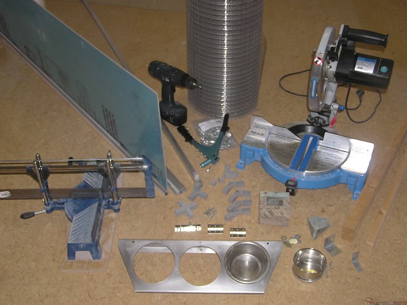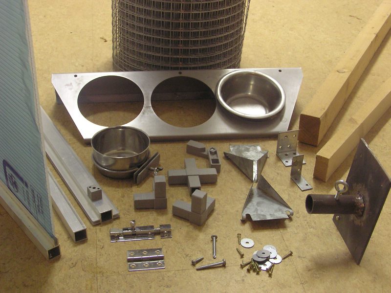 Die beiden obigen Bilder zeigt die wichtigsten Werkzeuge (Hand- und Motorsäge, Akkuschrauber, Blindnietzange, Schraubenzieher für Biteinsätze, Feilen für Metall- und Holzbearbeitung, Beißzage für den Volierendraht) und Materialien für den Volierenbau (Futter-Drehteller aus Edelstahl, Futternapf mit Halterung, 4-Kant-Aluprofile (20mm), Aluprofile für die Aufnahme von 4mm Doppelstegplatten, diverse Verbinder für die Aluprofile, Edelstahlscharnier, Aluriegel, Asthalterung zum Einhängen in den Volierendraht oder Festschrauben an der Wand, Asthalterung für einseitige Astaufnahme (Selbstgebaut aus einem Wasserrohr und einer Eisenplatte), Selbstschneidende Schrauben für die Aluprofile, Torxschrauben 3x20mm, Scheiben 4.3x20mm, Holzlatten 22x48 oder 24x48mm und 36x58mm sowie dazu passende Winkel (mit entsprechend langen Schrauben kann man die Latten auch direkt zusammenschrauben).