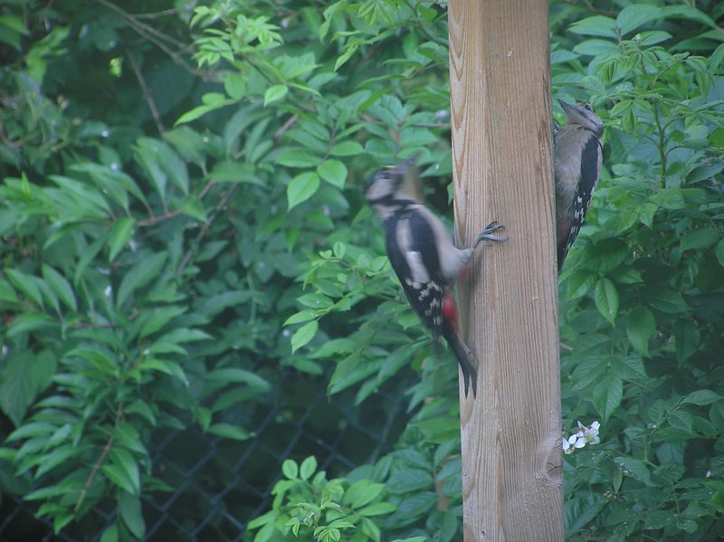 Die Buntspechte bescherten mir dann heuer im Sommer ein wirklich bemerkenswertes Erlebnis. Während Spechte bisher mein Futterhäuschen nur im Winter besuchten, kam diesmal ein Buntspechtweibchen mehrmals täglich um sich mit den Haferflocken vollzuschlagen. Mir kam das etwas merkwürdig vor, denn eigentlich sollte das Weibchen doch jetzt irgendwo im nahen Wald brüten und dort in der näheren Umgebung der Nisthöhle sein Futter suchen. Ich vermutete daher, dass es sich um ein nicht verpaartes Jungtier vom letzten Jahr handeln müsse. Das Spechtweibchen war ziemlich scheu und flog, wenn ich im Garten auftauchte, meist sofort Richtung Wald, sein Erscheinen kündigte es allerdings immer mit dem kaum zu überhörenden Buntspechtrufen „Tschik, Tschik“ an. Ich jätete im Garten Unkraut und war sehr in meine Arbeit vertieft als mir irgendwann die Spechtrufe auffielen, diesmal waren sie allerdings nicht kurzzeitig wie sonst, sondern anhaltend. Da ist wohl nichts mehr im Futterhäuschen vermutete ich, wollte aber meine Arbeit nicht unterbrechen denn jetzt dachte ich mal ausnahmsweise so wie manche extreme Vogelschützer die die Ganzjahresfütterung ablehnen. Ein Specht findet um diese Jahreszeit wirklich problemlos genug Futter. Wenn er Haferflocken wirklich so schätzt, sollte er eben warten bis ich nachfüllte.